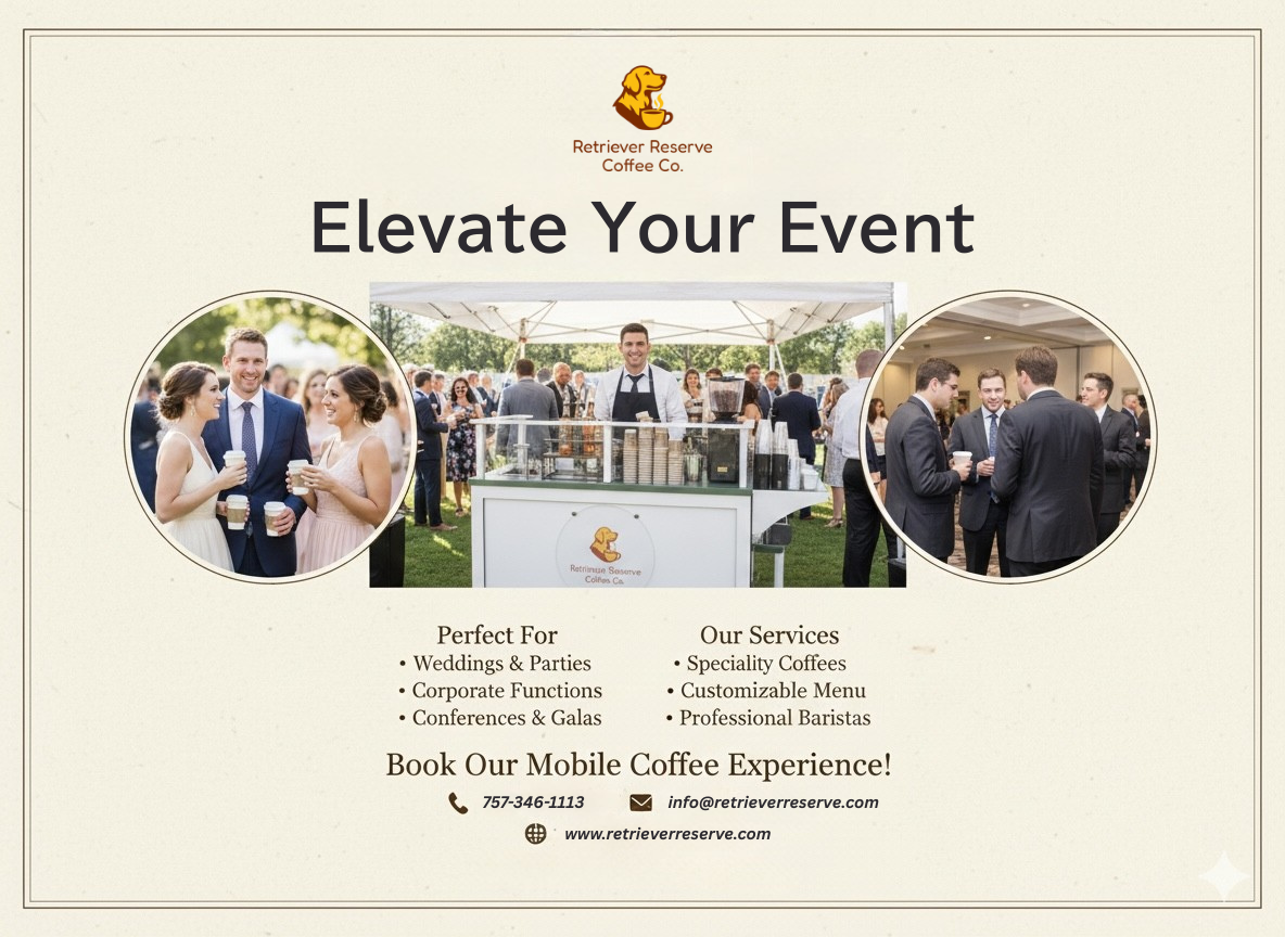 Retriever Reserve Coffee Company brings a refined mobile coffee experience to weddings, corporate gatherings, festivals, and special events throughout Pennsylvania. Our professional baristas serve handcrafted specialty coffees using premium ingredients, paired with customizable menus and elegant presentation.
